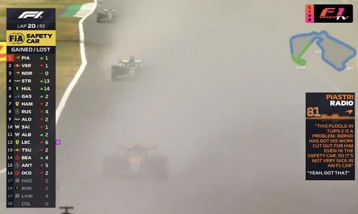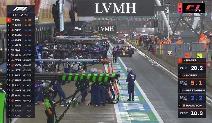 Половина пелетона поехала переобуваться, а Макларен фантастически обосрались с пит-стопами обоих пилотов — 3.1 для Пиастри и 5.1 для Норриса. 5 секунд!