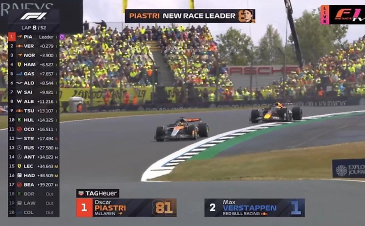 На 8 круге Пиастри очень красиво обходит Ферстаппена — все это время он держался в полусекунде от Макса и, как только разрешили открыть крыло, во второй зоне DRS совершил успешную атаку: