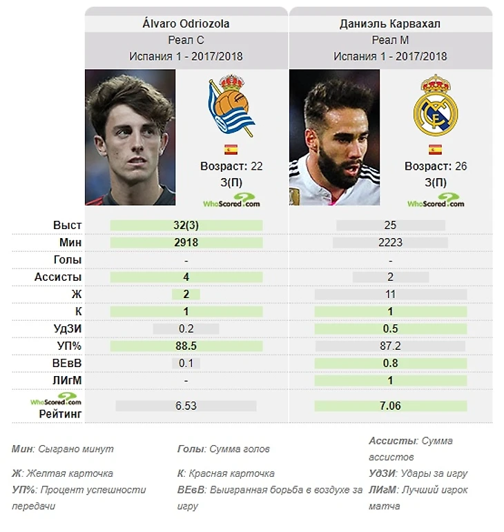 Говоря о тех игроках с которыми придется работать новому тренерскому штабу необходимо отметить новичков пополнивших состав в это межсезонье. Ими стали голкиперы Тибо Куртуа и Андрей Лунин, защитник Альваро Одрисола и полузащитник атакующего плана Винисиус Жуниор. Единственным игроком который покупается под основу скорее всего стоит считать Куртуа, но и ему придется доказать, что он сильнее Наваса который уже стал своим не Бернабеу. Остальные же игроки берутся на перспективу и на подмену завсегдатаям основного состава. Одрисола берется на смену Карвахалю дабы освободить от этой обязанности Начо который не очень эффективно смотрелся на этой позиции на протяжение всего прошлого сезона. Сравним некоторые статистические показатели Карвахаля и Одрисолы по прошлому сезону. Но нужно понимать, что сравнения эти довольно условны, если брать в расчет в насколько разных по уровню и стилистике командах провели эти игроки предыдущий сезон. Альваро провел на поле в прошлом сезоне 35 матчей в 32-ух из которых он выходил в основе, что на 10 матчей больше показателя Даниэля. При этом отдав за это время 4 голевые передачи и тут превзойдя защитника королевского клуба отдавшего только 2 результативные передачи в сезоне испанской Примеры забить же гол за футбольный год не удалось ни одному из спортсменов. В оборонительных показателях небольшое преимущество на стороне Карвахаля, а именно он совершает 1,2 больше отбора за игру, чем его более юный визави и на 0,8 больше перехватов. Точность передач сохраняется у двух оппонентов примерно на одном уровне 88% на 87% в пользу Одрисолы.