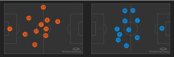 Все это в итоге заставило Локомотив играть преимущественно через левый фланг(48% атак строились именно через него), где у Спартака более надежный Ещенко, а на правом фланге оставался один измотанный Игнатьев против постоянно убегающих в его зону Промеса, Зе и Глушакова. Два чистых обыгрыша один в один от голландца привели к голевому моменту, однако, Зобнин не смог в падении переправить мяч в ворота, а забегание самого Квинси чуть не закончилось голом – скидка(именно скидка, а не прием мяча – посмотрите на повторе на взгляд десятого номера) оказалась чуть слабее, чем требовалось, а вышедший Гильерме уже не вряд ли бы смог помешать последующему удару.