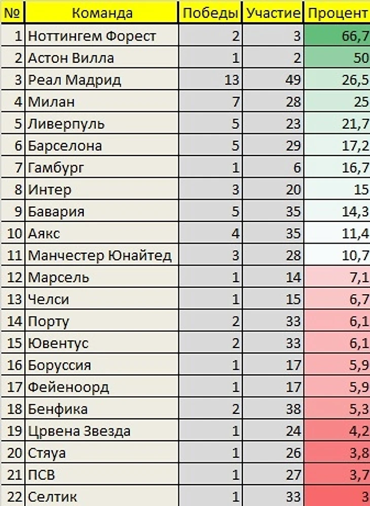 Вот так выглядит полный список победителей ЛЧ/КЕЧ и процент продуктивности каждой из команд: