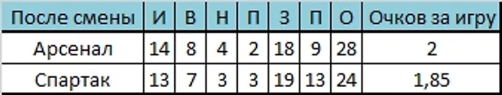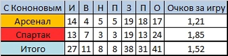 В этом чемпионате Кононов провел 27 игр(14 в Арсенале, 13 в Спартаке) и за этот промежуток его команды набирали в среднем чуть более полутора очка за игру, пропуская больше одного гола в среднем за матч. Статистика довольно средняя. А вот как выглядит аналогичная таблица для Арсенала и Спартака, когда их тренировали другие наставники.