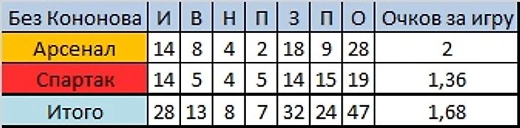 Сравнительная статистика Кононова в Арсенале и Спартаке, а также Арсенала и Спартака без него