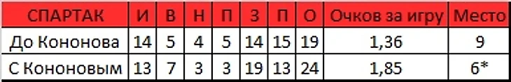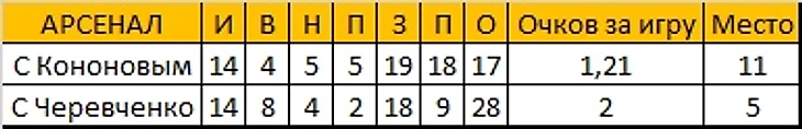 Без комментариев. Очевидно, что все указывает на одну простую истину: очков за игру, средняя разница, количество побед в среднем больше, когда у руля находился кто угодно, но не Кононов. Как вишенка на торте – сравнение Арсенала и Спартака после смены тренера. Стоит отметить, что в этот период уместилось разгромное поражение красно-белых в Туле.