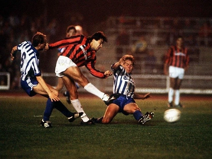В 1/8 финала судьба свела «Милан» с мадридским «Реалом». Жеребьёвка отправила команды сначала в Италию. Первый гол в матче пришёл с правого фланга. Марко ван Бастен подкинул мяч, чтобы перебросить защитника, но круглый отскочил не совсем так, как планировал Марко. Незапланированный отскок помог нидерландскому игроку. Ван Бастен ушёл к линии поля и навесил в штрафную площадь, где испанские защитники проворонили Франка Райкарда. Миланская «восьмёрка» головой переправила мяч в уголок и «Джузеппе Меацца» «взорвался» от восторга. Гол был забит уже на девятой минуте, а, спустя пять минут, ван Бастен вышел один на один с вратарём сливочных и Франсиско Буйо сыграл в ноги, а не в мяч. Судья указал на точку, с чем были не согласны игроки «Реала». Чтобы судья сказал, если бы уже в то время был var - неизвестно. Моё скромное мнение, что фол был за пределами штрафной площади. К точке подошёл сам Марко, который и переиграл вратаря соперника. Два быстрых гола сбили темп игры итальянцев и «Реал» смог немного огрызаться. Игра стала более грубой, но голов больше в том матче не было. Был в игре ещё один спорный эпизод. Нападающий «Реала» упал после контакта с вратарём «Милана», но судья не усмотрел нарушения правил.