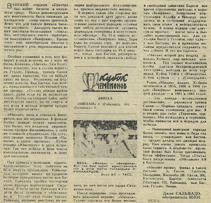 Вообще, 1990 год, пожалуй, один из лучших годов для итальянских клубов на международной арене. Они выигрывали всё что можно. Кроме «Милана», победителем Кубка обладателей кубка стала «Сампдория», а Кубок УЕФА взял «Ювентус», который переиграл итальянскую «Фиорентину». Добавьте к этому ещё и победу «Милана» 9 декабря в Межконтинентальном кубке, где «красно-чёрные» разгромили парагвайскую «Олимпию» и вы согласитесь с моей мыслью. Эх, братья Италии, Италия пробудилась, шлемом Сципиона она увенчала голову. Где же победа? Итальянский футбол развивается волнообразно, будем надеяться, что после кризиса начнётся возрождение. Здорово, когда в мире много конкурентных лиг.