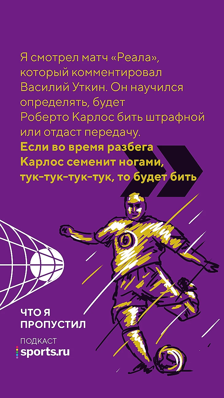 Маслов: Ты сказала про Василия Уткина, «Футбольный клуб». И у меня сразу воспоминание из детства. Я тогда записывал Лигу чемпионов на кассеты. Она шла ночью, мне родители не разрешали смотреть. В два ночи, может, ее в записи показывали. Короче, я смотрел на следующий день какой-то матч «Реала», который комментировал, естественно, Василий Уткин. И он сам научился (или кто-то ему сказал) определять, будет ли Роберто Карлос бить штрафной или будет отдавать передачу. И если во время разбега Карлос семенит ногами, тук-тук-тук-тук, то будет бить. Если он спокойно разбегается, то скорее всего отдаст передачу. Я прям помню, он говорит: «Так, семенит или нет? Так, семенит, все, будет удар! Оп. Я же вам говорил».