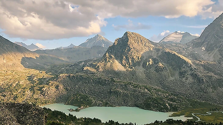 На шестой день похода у нас был запланирован первый перевал. Мы должны были подняться на 450 метров, пройти через седловину перевала Кульдора Восточный, спуститься еще на 750 метров и встать лагерем на берегу озера Дарашколь. План провалился: неопытные и уставшие ноги большинства участников группы разрешили пройти только половину спуска, и мы заночевали где-то посередине. План на следующий день немного изменился: спуститься к озеру, перейти вброд реку, впадающую в него, пройти немного по противоположному берегу и встать лагерем на живописном мысе, который сильно вдается в озеро.