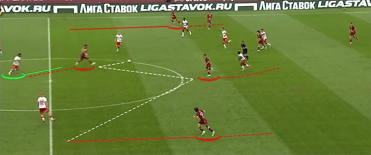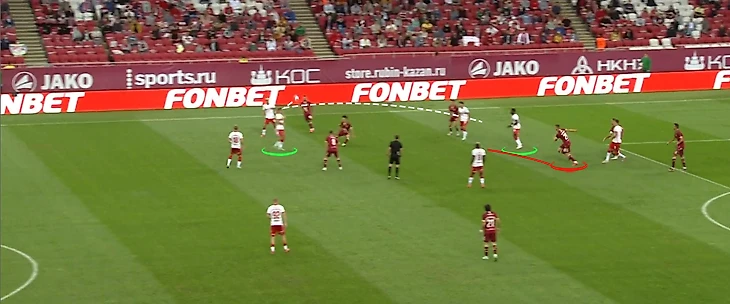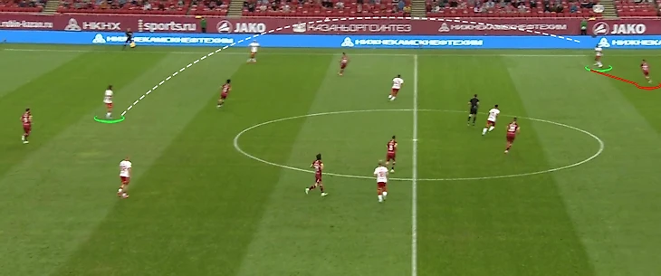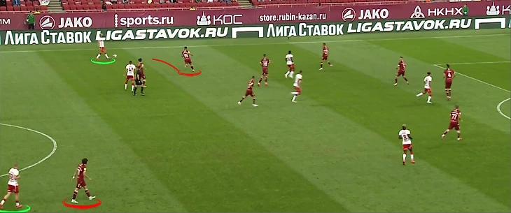 Целью Рубина в атаке, как уже понятно, было создать наибольшее пространство для своих атакующих игроков и создать максимальное количество моментов 1в1 между Хвичей и Рассказовым. Из раза в раз варианции на достижение цели могли меняться, был лишь один частый паттерн и цель: обособить пару Рассказов-Хвича. По тому как часто происходили похожие ситуации, мы можем утвердительно говорить о том, что полузащитники Рубина четко понимали свои действия, а игроки Спартака не знали как этому надежно противостоять. Ещё одной причиной ведения игры через фланги стали Промес и Мозес. В отличии от игроков Рубина они часто игнорировали задачи в обороне, или опускались слишком поздно в свои зоны. Так что данную игру можно нельзя назать определенной случайностью. По верхнему эпизоду хорошо видно как Мозес проигнорировал врывание шатова в свободное пространство (хотя отлично его видел), Промес так же не спешит помогать и сосредоточен на мяче. Совершенно очевидно, что подобный план работал не всегда, а только при быстрых атаках. Как и в матче кубка казанцы так же постоянно пользовались переводом мяча в широкие зоны, где Рубин старался создать как минимум численное равенство, иногда действовали очень агрессивно. В данном случае в зоне Аиртона располагаются сразу 3 соперника, и если мяч после борьбы останется за Рубином, перевод доставит очень много проблем обороне красно-белых: