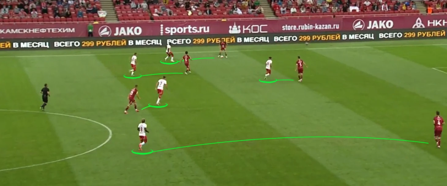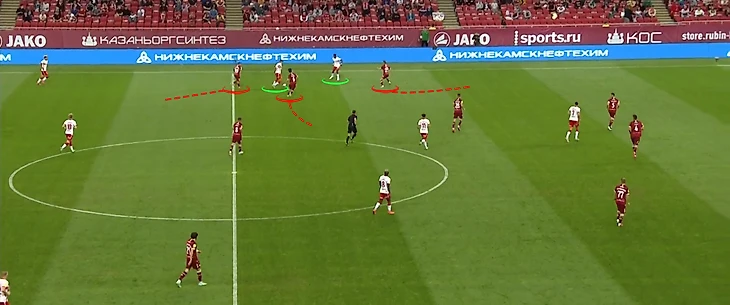 1. Спартак, как и обычно, поднимался в высокий прессинг. Движениями полузащитников Рубин старался вовлечь максимальное количество игроков Спартака высоко (!).