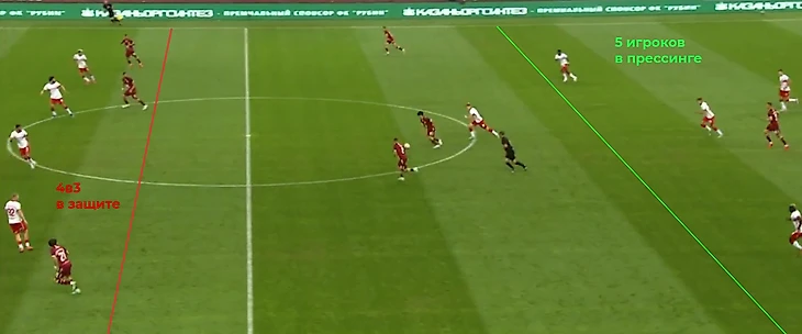 2. Рубин заставлял играть Спартак с низкой линией обороны, постоянно выжимая её к воротам Максименко. За счет того, что казанцы выдвигали трёх (реже двух) игроков высоко, Спартак не мог создавать офсайдные ловушки. Если левый фланг Аиртон мог страховать за счет скорости, то провоцировать дуэль Хвичи и Рассказова никому не хотелось — слишком большой риск.