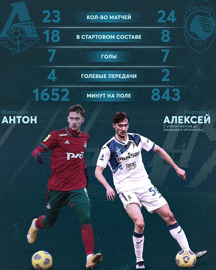 Автор Алексей Антипов Сравнительная статистика братьев Миранчуков по ходу сезона 2020-2021