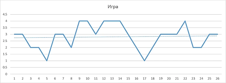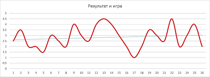 Может лучше станет видно в графике с субъективной оценкой результатов игры. Тут очень заметны высокие оценки с 9го по 15й матч. Судя по всему, это был пик этого Спартака. Закончился этот пик вместе с первым таймом матча с Лестером. Грустно, что за 26 матчей не было ни одного матча с максимальной оценкой игры, не случилось ни одного разгрома, ни одной уверенной победы над сильным соперником, что, конечно, симтоматично.