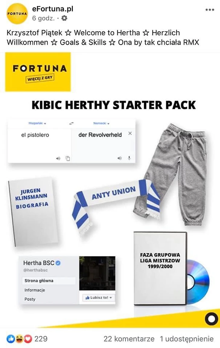Польская букмекерская контора "Fortuna", оригинально оформила тему перехода Кшиштофа Пёнтека в стан берлинской "Герты", создав коллаж из самых необходимых вещей, которые нужно знать о столичном клубе. Среди всего прочего выделяются диск с записью выступлений "Старой Дамы" в Лиге Чемпионов сезона 1999/2000, а также легендарные штаны культового венгерского голкипера Габора Кирая.