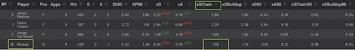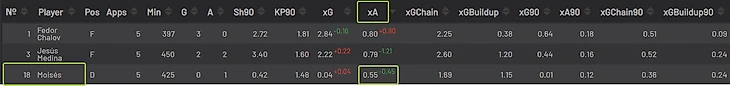 Отдельного упоминания стоит участие Мойзеса в атакующих действиях армейцев. Бразильский крайний защитник уже успел отметиться ассистом ("Ахмат" - отдал голевую передачу на Хесуса Медину) и раздать 8 ключевых передач. По данным understat.com (если брать отрезок c 5 по 9 тур) игрок левой бровки вслед за игроками линии атаки Хесусом Мединой, Федором Чаловым и Хорхе Карраскалем является четвертым по значимости в построении атак ЦСКА (xGChain 1,69) и третьим по такому показателю, как xA (0,55) - ожидаемые ассисты.