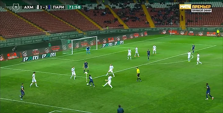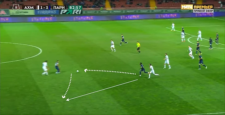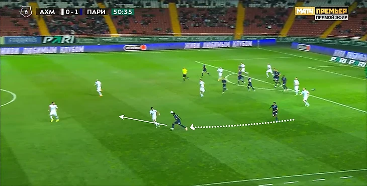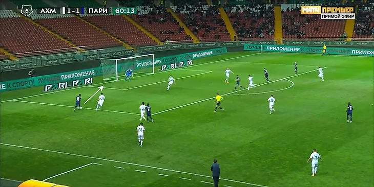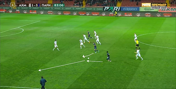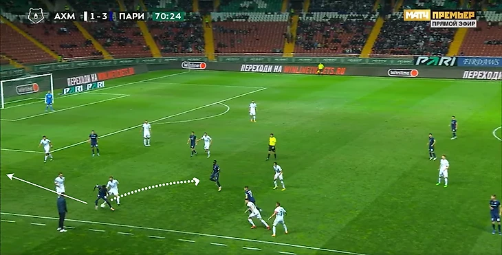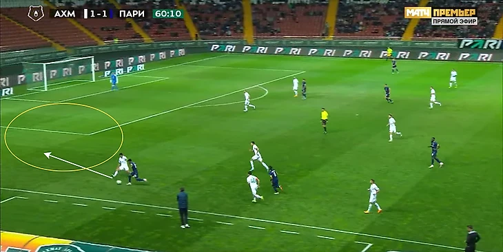 61-я минута - вингер "Пари НН" получает идеальную ситуацию один в один и огромное пространство за спиной защитника.