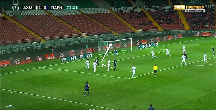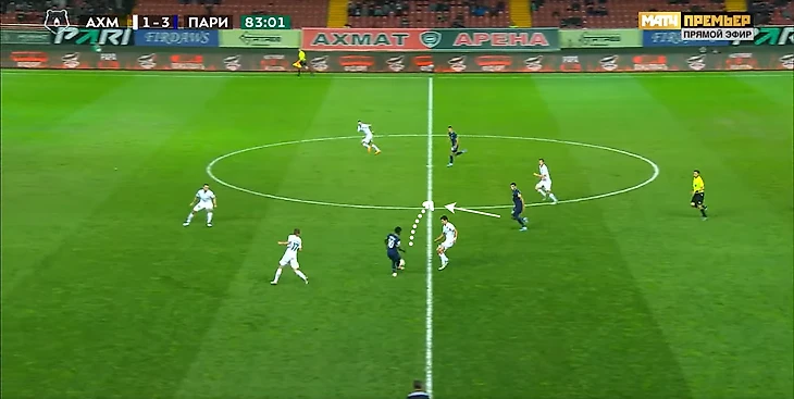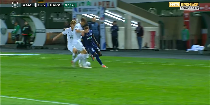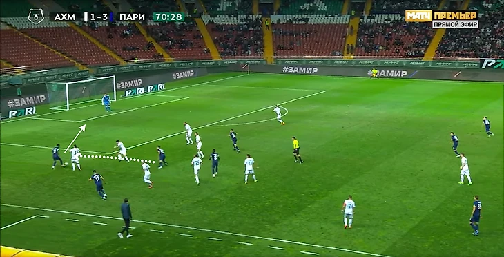 На 51-й минуте Милсон подбирает вынос после углового "Ахмата", пробрасывает мяч мимо игрока грозненской команды и организует быструю атаку "Пари НН" через пас на свободное пространство Калинскому.
