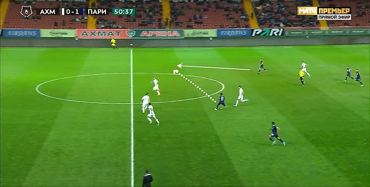Игроки "Ахмата" просто не успевают и он вновь вскрывает левый полуфланг грозненской команды.