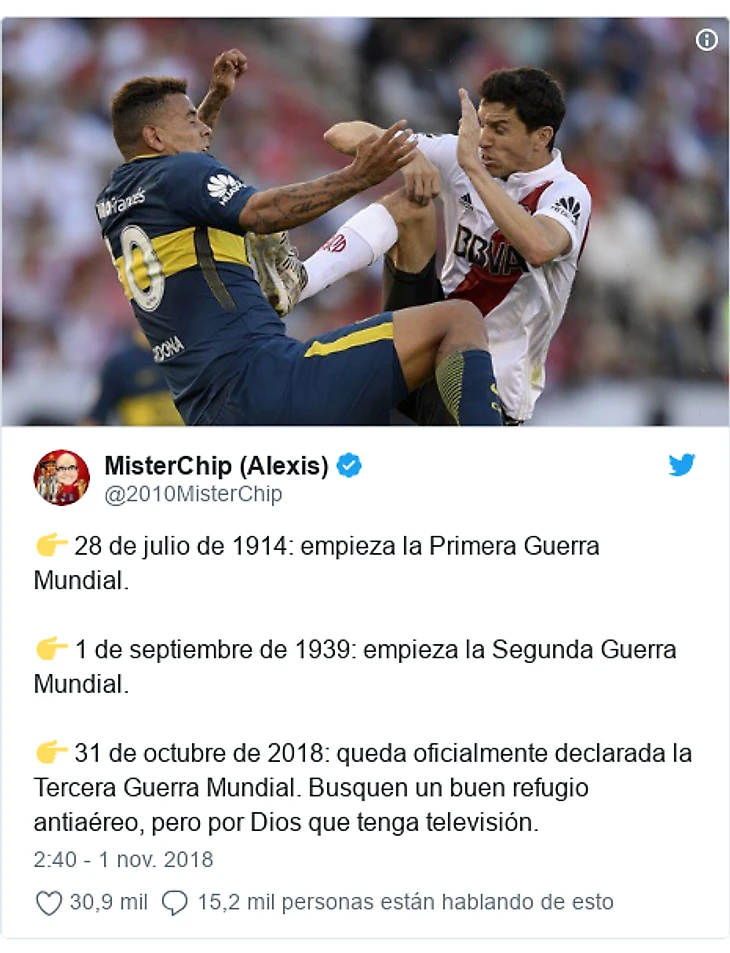 Источники:https://www.bbva.com/es/8-curiosidades-no-sabias-del-superclasico-river-plate-boca-juniors/ ||| https://www.forbes.com/sites/robertkidd/2018/11/01/boca-juniors-to-play-river-plate-in-historic-superclasico-copa-libertadores-final/#5d92b94e68a3 ||| https://www.theguardian.com/football/2018/nov/01/boca-juniors-set-up-copa-libertadores-final-superclasico-with-rivals-river-plate-football ||| https://ru.wikipedia.org/wiki/Ривер_Плейт ||| https://ru.wikipedia.org/wiki/Бока_Хуниорс ||| https://www.bbc.com/mundo/deportes-46059176 https://www.goal.com/es-ar/noticias/pura-historia-los-records-del-superclasico-entre-boca-y/12atpm7jedsng1qt8b3nz6pw99 ||| https://www.foxsports.com/soccer/story/macri-backtracks-on-away-fans-at-copa-libertadores-final-110218 ||| https://www.fanchants.com