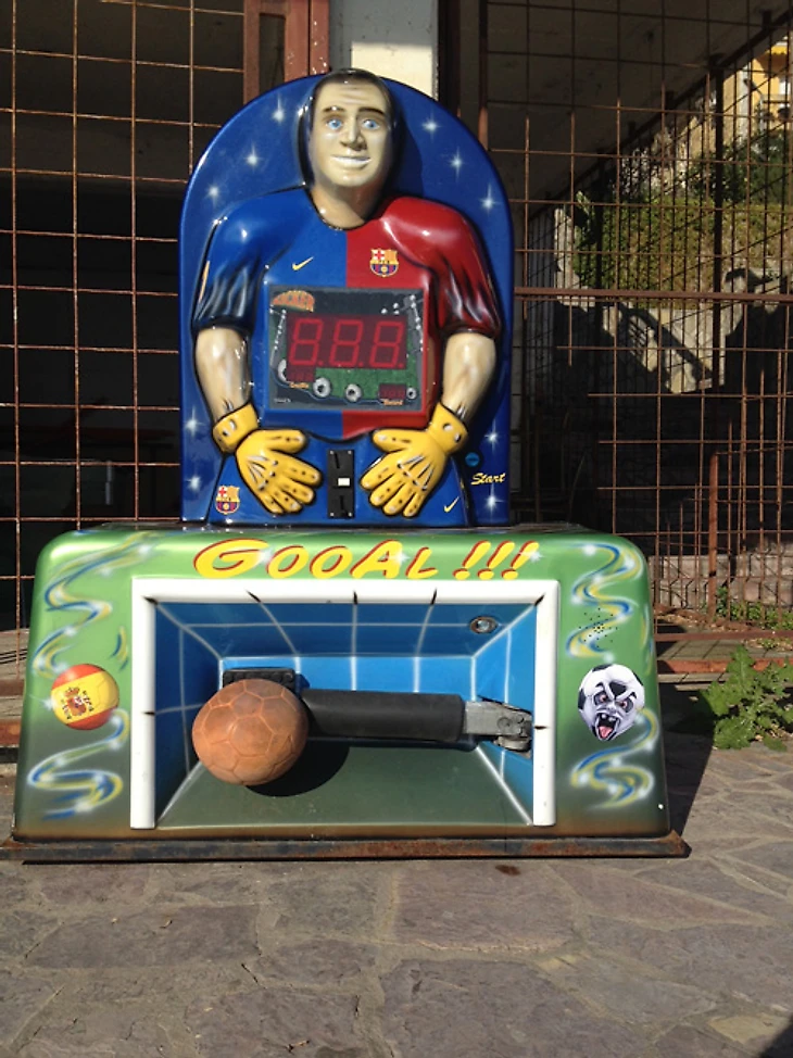 Это пугало сейчас отдыхает на набережной. Не сезон. Детей мало – что мучить его понапрасну? Автомат, очевидно, был изготовлен в Китае – где же еще? – метрополии ширпотреба, товаров для простодушных. Обладателю жетончика ценой в евро, очевидно, предлагается попасть маленьким мячиком в дырку. Как изобразить чучело, во что его нарядить? Чем возбудить сетчатку глаза малыша? Не думаю, что оформитель игрушки долго раздумывал над этим. Он раскрасил грудь истукана в цвета «Барселоны». Хотя мы тут могли бы тонко заметить, что «Барселона», скорее, олицетворяет идею нападения, чем пассивного выжидания того, куда прилетит мячик – в дырку или мимо.