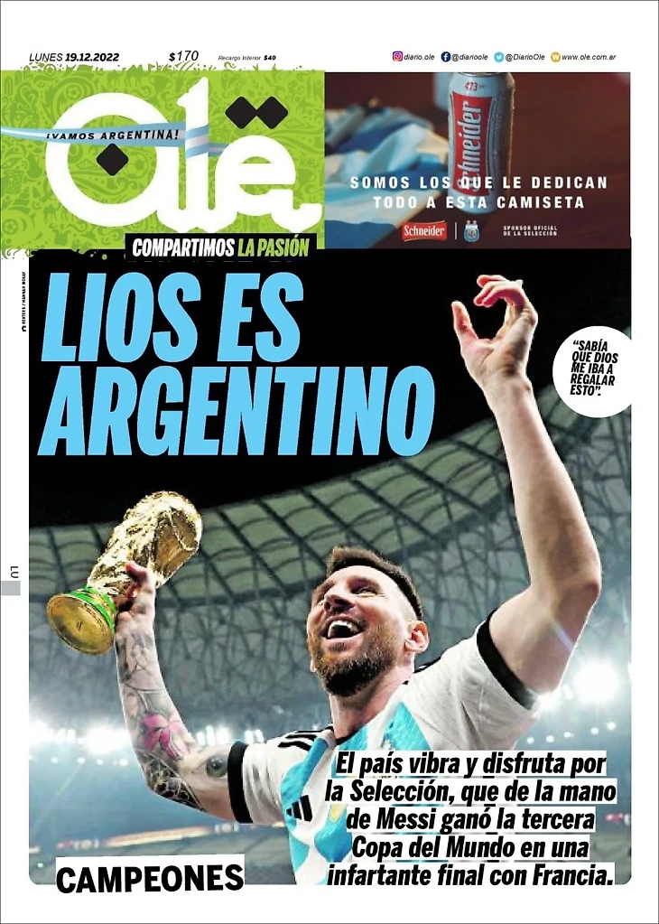 Ole (Аргентина) обыгрывает фразу Díos es Argentino (Бог – аргентинец), меняя первую букву на Л