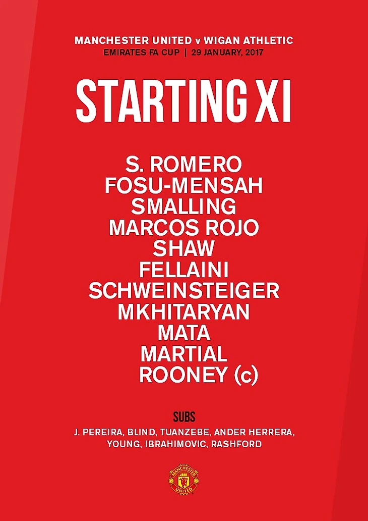 Жозе после выхода в финал Кубка Лиги все же не удержался и на пресс-конференции как всегда сморозил чушь о том что счет матча 1-1 и Юнайтед не проиграли. Но все же со временем пыл отсыл и успокоившийся коуч красных сегодня прибег к частичной ротации. Честно говоря даже не знаю какое событие имеет больше резонанса: выход в старте Швайнштайгера или отсутствие Погба даже в заявке?) Но факт остается фактом, в опорную зону вышли немец вместе с Феллайни, а над ними четверка: Мата, Марсьяль, Мхитарян и Руни. Также свой шанс получил Фосу-Менса, Шоу тоже вышел с первых минут, но он здесь появился исключительно для ротации так как уже давно известно что он будет менять клуб. Также в заявку не попал Валенсия который попал в Манчестер из Уигана.