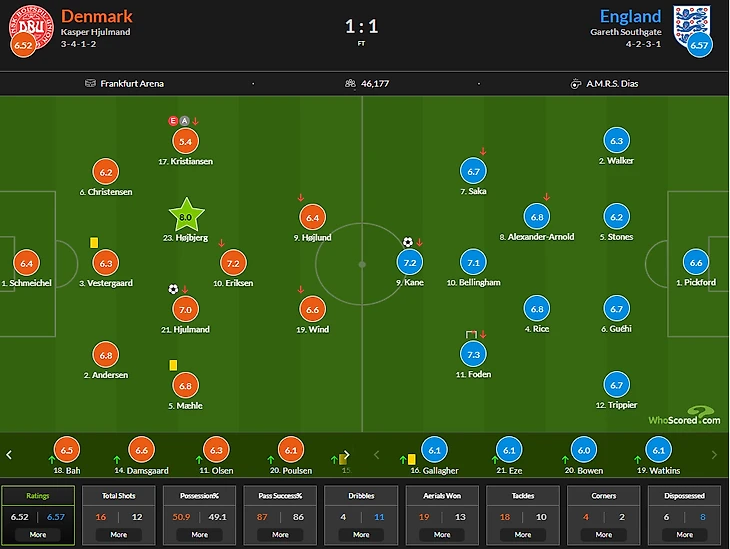 - это не самое главное. Датчане чаще пасовали на чужой половине, имея в первом тайме баланс уровня 60 на 40. У Англии более стерильный контроль и перепасовка под прессингом не без огрехов