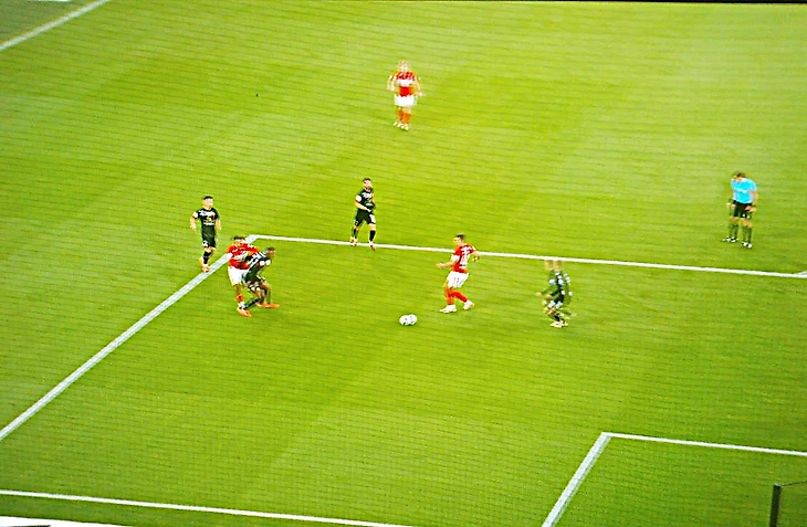 49:34 - Не проходит и двух минут, на этот раз Обляков сбивает в штрафной Маркиньоса, врезаясь ему в ногу и толкая в спину (Фото 4). Свисток снова молчит! Любимов, вернувшись из уборной, зовёт Кирилла к монитору. Тот смотрит в упор, но не видит нарушения.