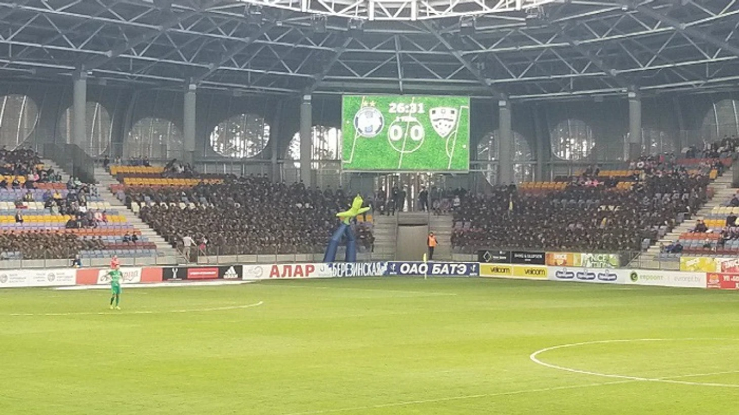 Вы спросите: "Ну а что там БАТЭ?". Я скажу, что и на стадионе в Борисове есть на что посмотреть, только от этого зрелища может зарябить в глазах. Частыми гостями трибун на "Борисов-Арене" являются солдаты. Но как писал в своей статье "The Vashkevich" на страницах Прессбола, что никто не загоняет военнослужащих на стадион, нет никаких разнорядок, а приходят они по собственную желанию организованными группами и НЕ бесплатно. Сам был свидетелем, как солдаты пришли поддержать борисовский клуб, и на их сплочённые кричалки мы с гостевого сектора ответили воякам кратко и звучно: "дембель не скоро". А вообще судить вам, сами они приходят на стадион нет, я только оставлю здесь этот кадр, с матча "БАТЭ" - "Шахтёр", который проходил 24.06.2018.