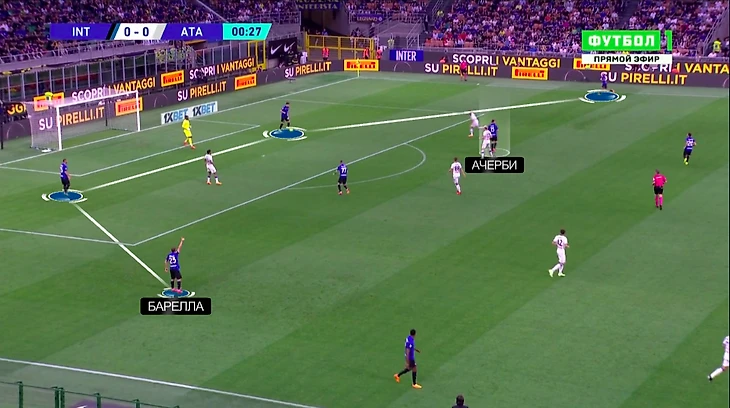 Помимо смелости разыгрывать под давлением, поражает разнообразие приемов, которые есть у Симоне Индзаги. Против «Аталанты» особенно запомнилась структура, когда команда перестраивалась с пятерки на четверку защитников. Часто это происходило за счет движения Франческо Ачерби и Николы Бареллы. Первый превращался из центрального защитника в дополнительного опорника, а второй – уходил из полузащиты на правый фланг обороны.