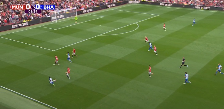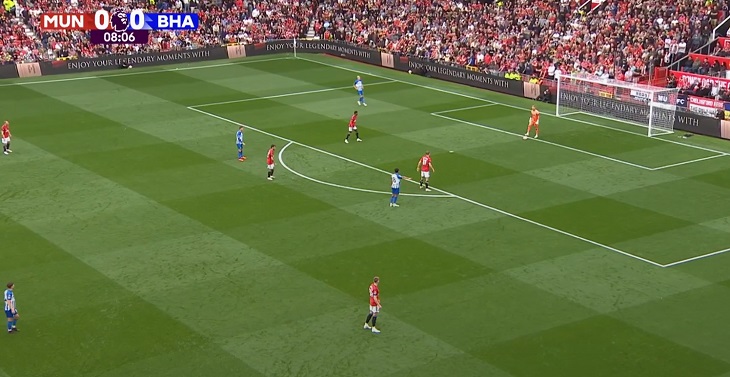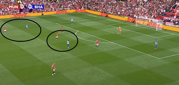 Важная роль в ромбе ложилась на крайних полузащитников в схеме – Мактоминея и Эриксена: они прикрывали фулбеков и одного из опорников «Брайтона», второго держал Бруну.