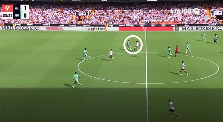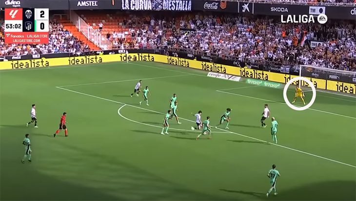 2. «Валенсия» летит в контратаку, Марио Эрмосо выбрасывается на Франа Переса – и выбивает мяч прямо в него. Результат: шокированный Аксель Витцель и выход один на один.