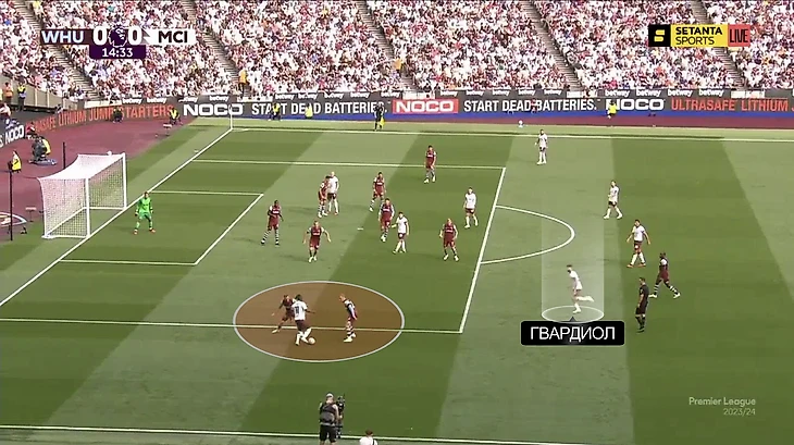 Второй прием – примагничивание соперников. Когда Цоуфалу пытался помочь Джеррод Боуэн, Доку отдавал на свободного Гвардиола. Тот пользовался свободой и тоже обострял: