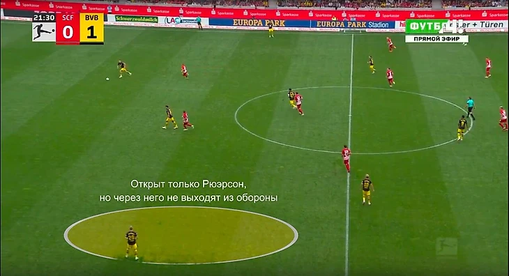 Тактически интересен первый тайм, где «Фрайбург» презентовал спорный, но точно оригинальный прессинг-план. «Фрайбург» перекрывал двух центральных защитников Хуммельса и Шлоттербека, опорника Джана, левого защитника Бенсебаини, игроков повыше – всех, кроме правого защитника «Дортмунда» Рюэрсона.