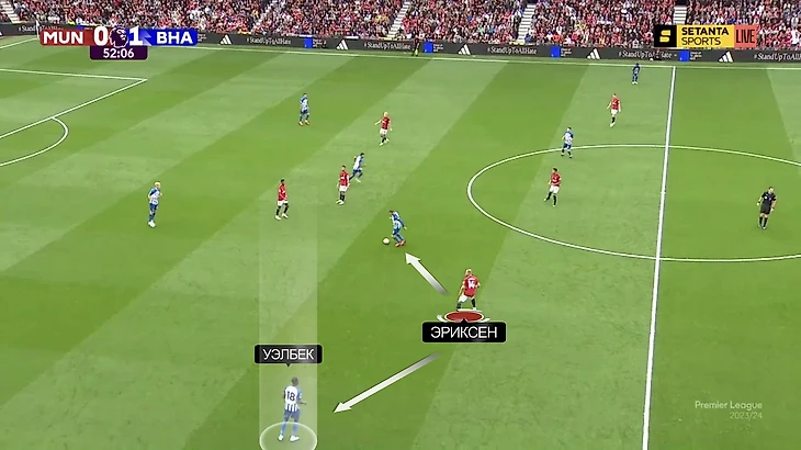 Эриксен на старте тоже справлялся: накрывал и Велтмана, и Гросса. «Брайтон» был в шоке первые 15 минут, но перестроился – из-за выбора Бруну (чаще накрывал статичного Дауда) и гениальности Паскаля Гросса. Немец стал уходить подальше от Велтмана – Эриксен выбирал идти за опасным соперником и бросал флангового защитника.