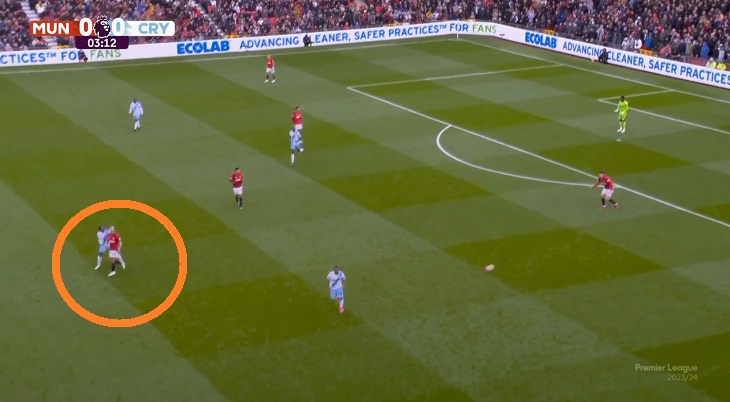 Против «Кристал Пэлас» (0:1) начало билдапа получалось стандартным: Далот или Каземиро становились третьим центральным защитником, Амрабат поднимался в центр. Оттуда Софьян мог запускать диагональ направо – на Пельистри или Далота: марокканец лучший по количеству продвигающих передач (12).