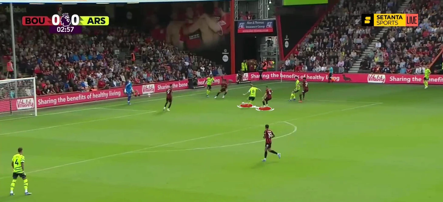 Еще у норвежца были более широкие полномочия под чужим прессингом. Опускался глубже, чем обычно, выманивая Льюиса Кука, так как в центре «Борнмут» давил персонально. Как правило, именно в этом месте рвался прессинг соперника – Эдегор может и отдать под давлением, и манипулировать позицией оппонента так, чтобы открылась линия для паса на партнера.