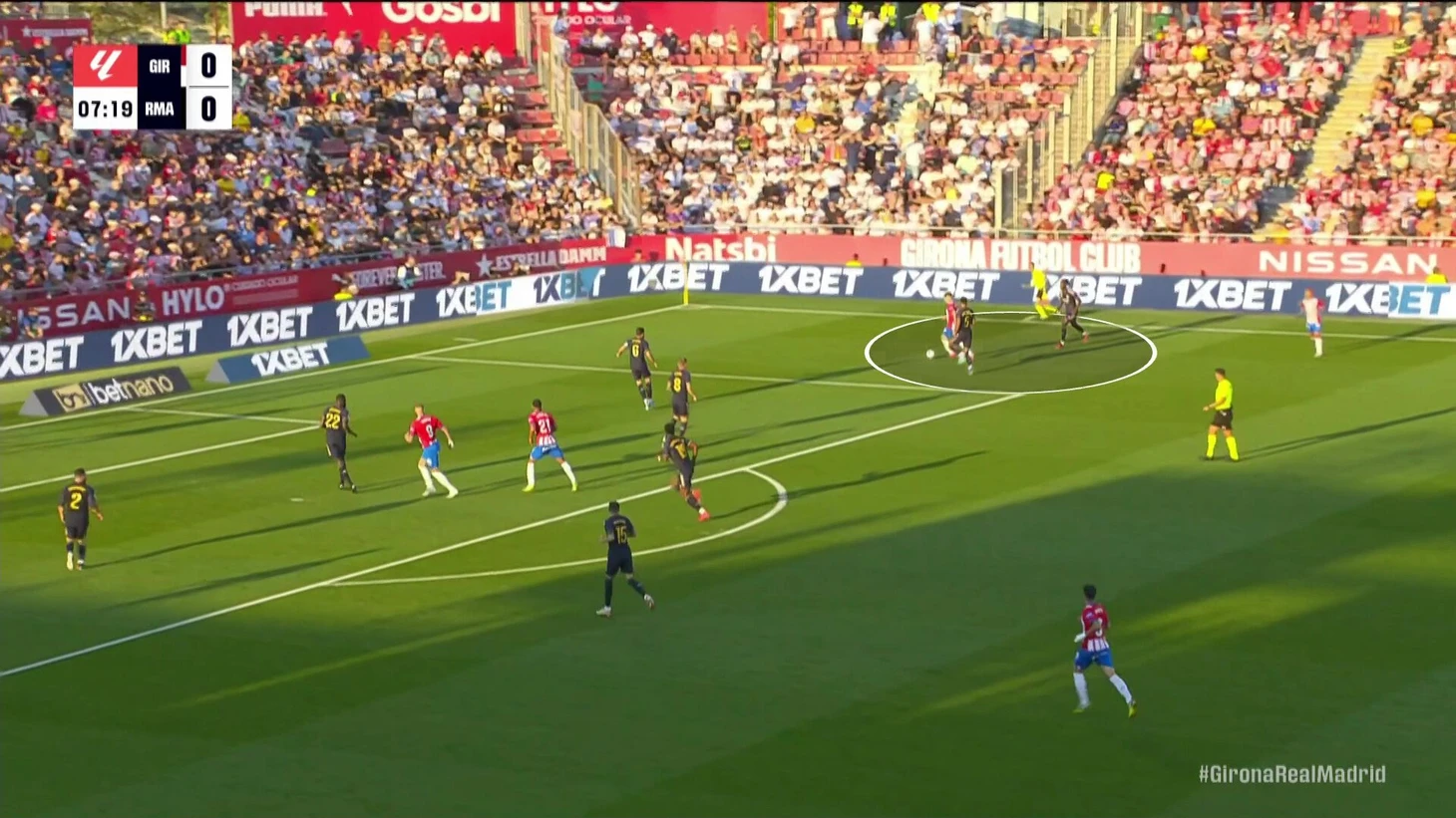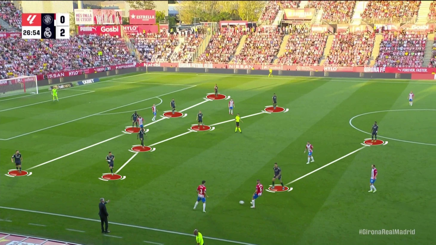 Последняя пара сыграла особенно ярко, так как «Жирона» больше целила именно в эту зону. В первом тайме открывались Цыганков и Коуто. При обычной схеме «Мадрида» были бы частыми ситуации 2-в-1, но с учетом адаптации Камавинга всегда помогал Беллингем: