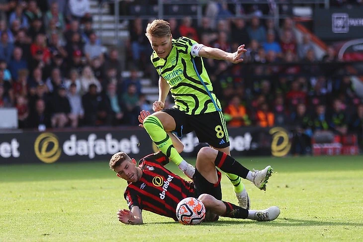 Даже на уровне первичной статистики Мартин Эдегор против «Борнмута» (4:0) собрал полный комплект действий – гол+пас+предголевой пас+заработанный пенальти. Это косвенно отражает его влияние на все стадии – даже на паузы между эпизодами (убедил Габи Жезуса отдать Каю Хавертцу пенальти, что привело к первому голу немца за «Арсенал» – возможно, главное чудо от Мартина).