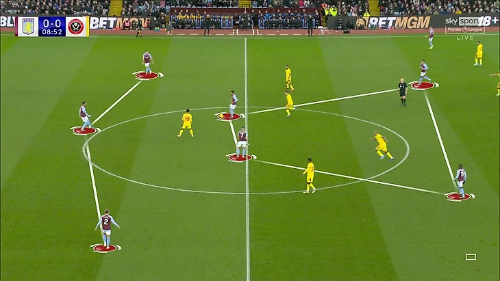 При этом у «Виллы» есть четкая идея в позиционке. Проблема скорее в ее предсказуемости. Команда располагается в структуре с тремя защитниками и квадратом в центре: