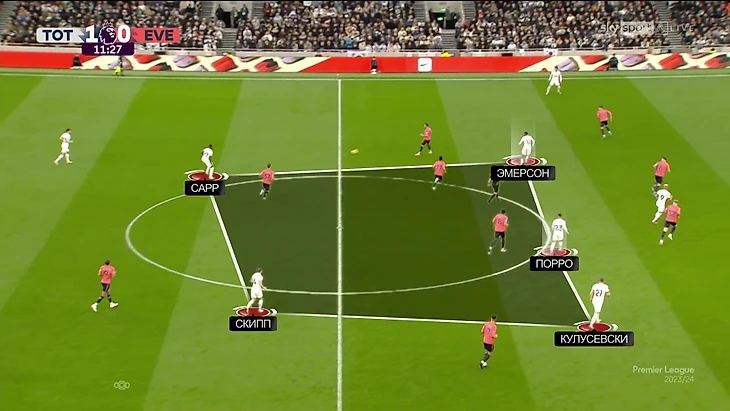 При этом структурно все выверено. «Тоттенхэм» нагружает центр пятеркой игроков, но никто не крадет зону у партнера. Момент завершится путаницей «Эвертона» по поводу опеки Эмерсона. Бразилец после рывка на фланг окажется свободен и отправит мяч в штрафную. Это частый и весьма отлаженные маневр в структуре Постекоглу.