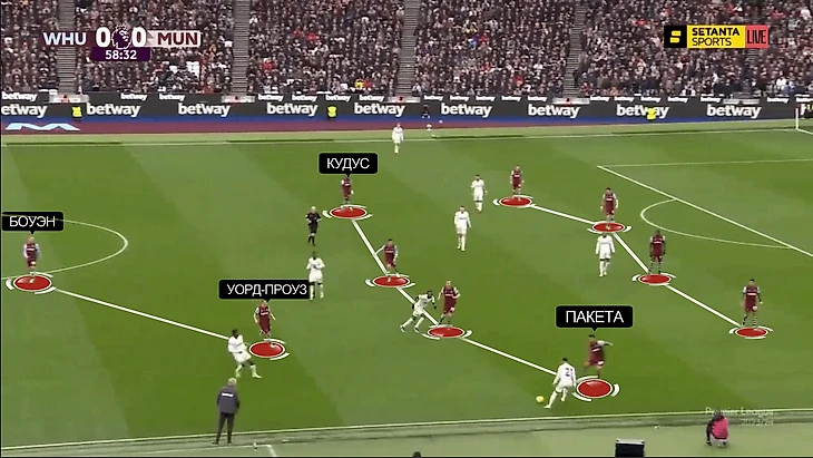 Ход сработал. Перед первым голом Кудус и Пакета перегрузили опорную «Юнайтед» (бразилец остался свободен и вырезал классный пас на Боуэна). Второй забили после их стеночки. Показательно количество передач, которые сделали Кудус и Пакета друг другу. До перестановок – всего одну, после – сразу 7.