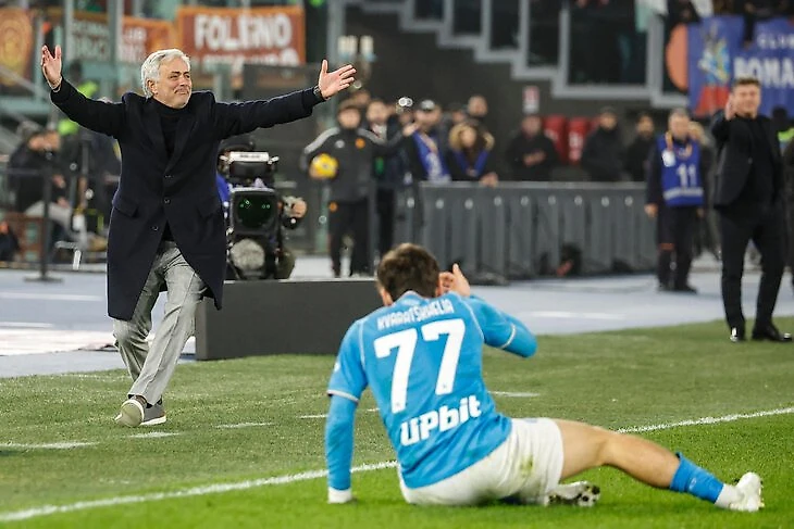 Моур противопоставил хаосу именно это – детальный контроль. «Рома» высоко прессинговала, но всегда небольшими группами: так Жозе предупреждал возникновение открытых мячей и одновременно создавал численное преимущество в зоне Осимхена и рядом с вероятным адресатом передач. Мадзарри лишился главных оружий – атаки пространства и превосходства в подборах.