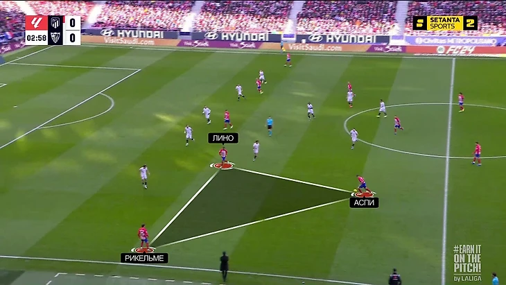 Чоло выпустил сразу двух латералей – Самуэла Лино и Родриго Рикельме, конкурентов по позиции. Бразилец отправился в центр, по задумке Симеоне он должен был дать движение, а Рикельме выдвигаться вперед, оставляя зону защитнику. Им стал Сесар Аспиликуэта.