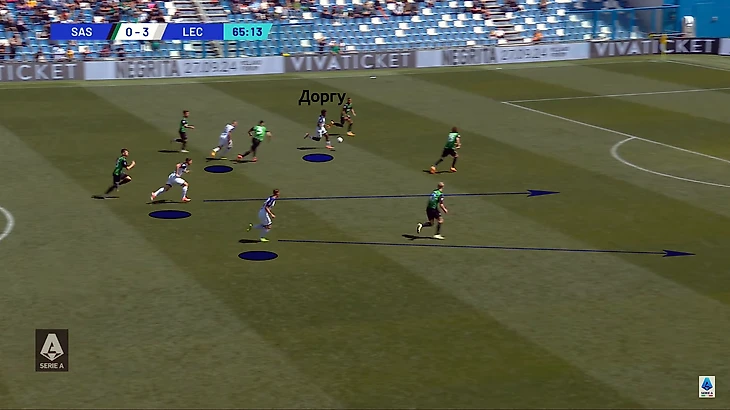 Разгром конкурента обеспечил классный ход Готти. «Лечче» часто выходил из обороны длинным пасом. На линии с нападающим выстраивались два-три партнера, а левый вингер Доргу забегал ему за спину. Когда мяч оказывался у крайка, напарники веером разбегались по богам от него – в каждую брешь между защитниками.