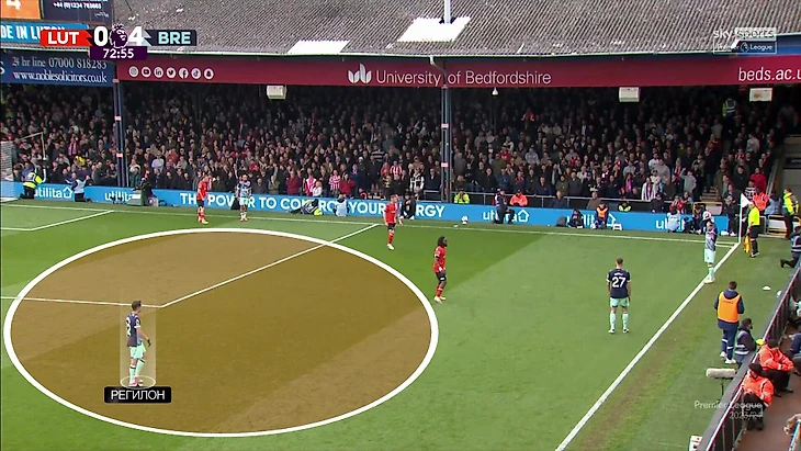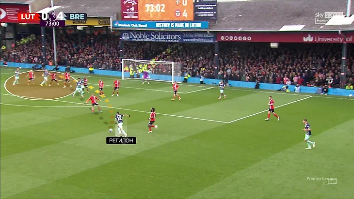 Особенно показательный момент из матча против «Лутона» (победа 5:1). Регилон при ауте идет в правую часть поля, чтобы получить свободу (так далеко за ним никто не идет) – и навесить после получения мяча: