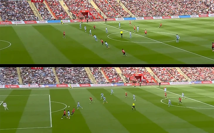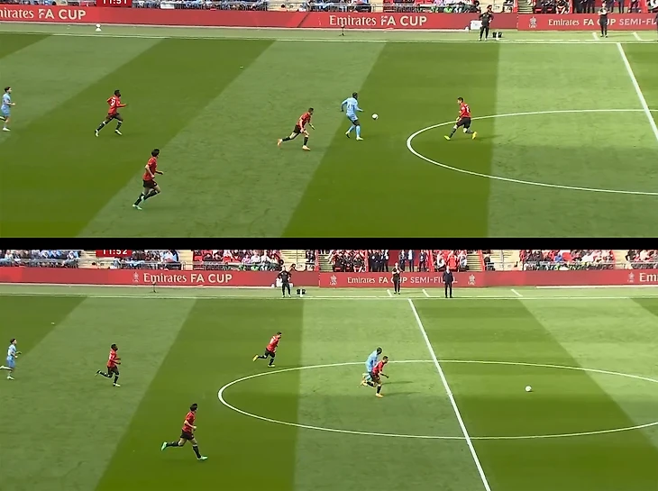 Дальше пример полезности связки Каземиро и Магуайра при отсутствии прессинга – оба способны создать опасный момент дальним пасом. На 18-й Каземиро вывел Рэшфорда на рандеву с голкипером (но англичанин не справился):