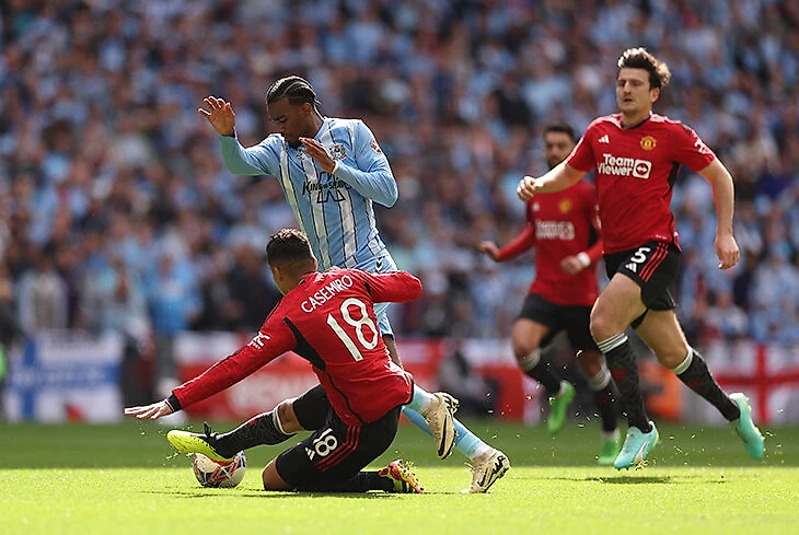 «Ковентри» почти не беспокоил защиту «Юнайтед» в первом тайме – со старта выстроились в контратакующую 5-3-2 и пробили всего раз в сторону манкунианцев. Но все же в паре моментов Каземиро пришлось поработать:
