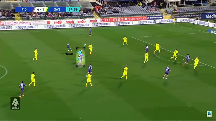Но «Сассуоло» сломал другой прием: крайки-опорники. В фазе владения Нико Гонсалес и особенно Риккардо Соттиль бросали фланг и превращались в разыгрывающих. Яркий пример – расположение перед одним из голов: вингер Соттиль исполняет реджисту между двумя профильными опорниками.