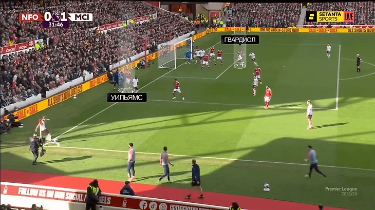 Удача проявилась и в случае с первым голом, который забил Йошка Гвардиол. Мяч пришел после углового и крутой подачи Де Брюйне во вратарскую, но в момент, когда «Сити» получил преимущество 11 x 10. В эпизоде перед корнером травму получил правый латераль «Форест» Неко Уильямс: